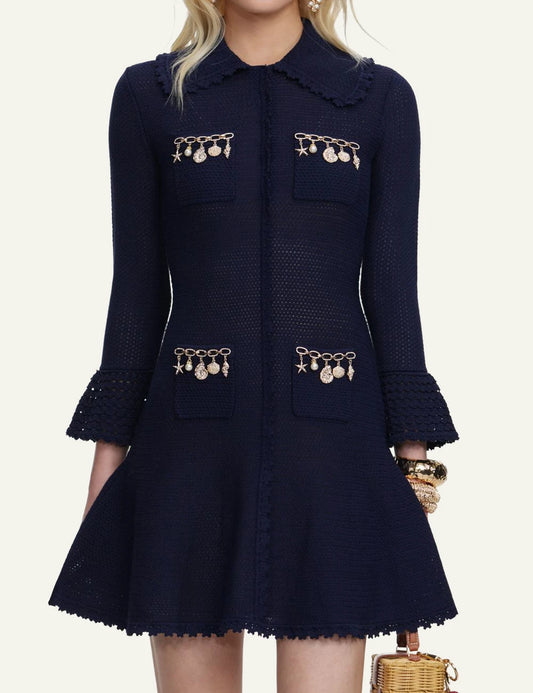 SELF-PORTRAIT EMB KNIT MINI DRESS NAVY