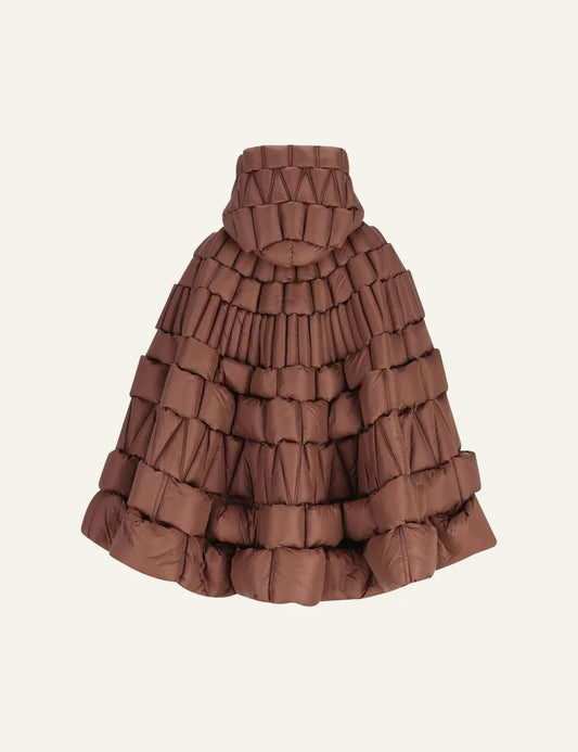 • Raxxy brown 3D quilted cape puffer σε front view, με high collar και sculptural padded blocks.
