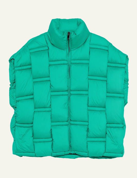 • Oversized puffer jacket σε electric blue, box-quilted texture, high collar, women’s outerwear fashion.