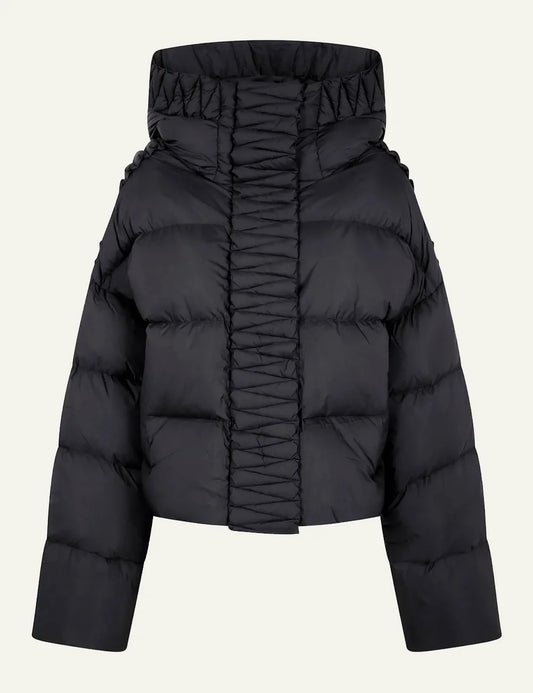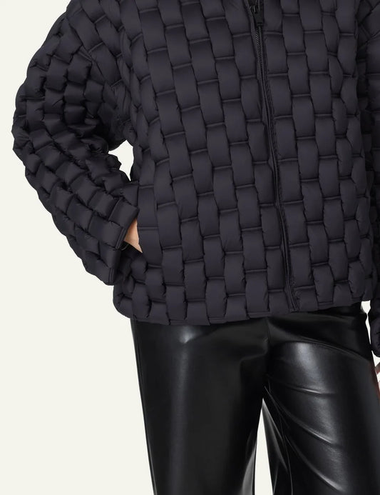 • Raxxy black 3D quilted cape puffer σε front view on model, με sculptural padded blocks και dramatic full-length silhouette.