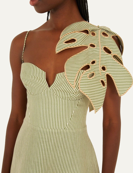 FARM RIO Green Striped 3d Monstera Leaf Linen Midi Dress