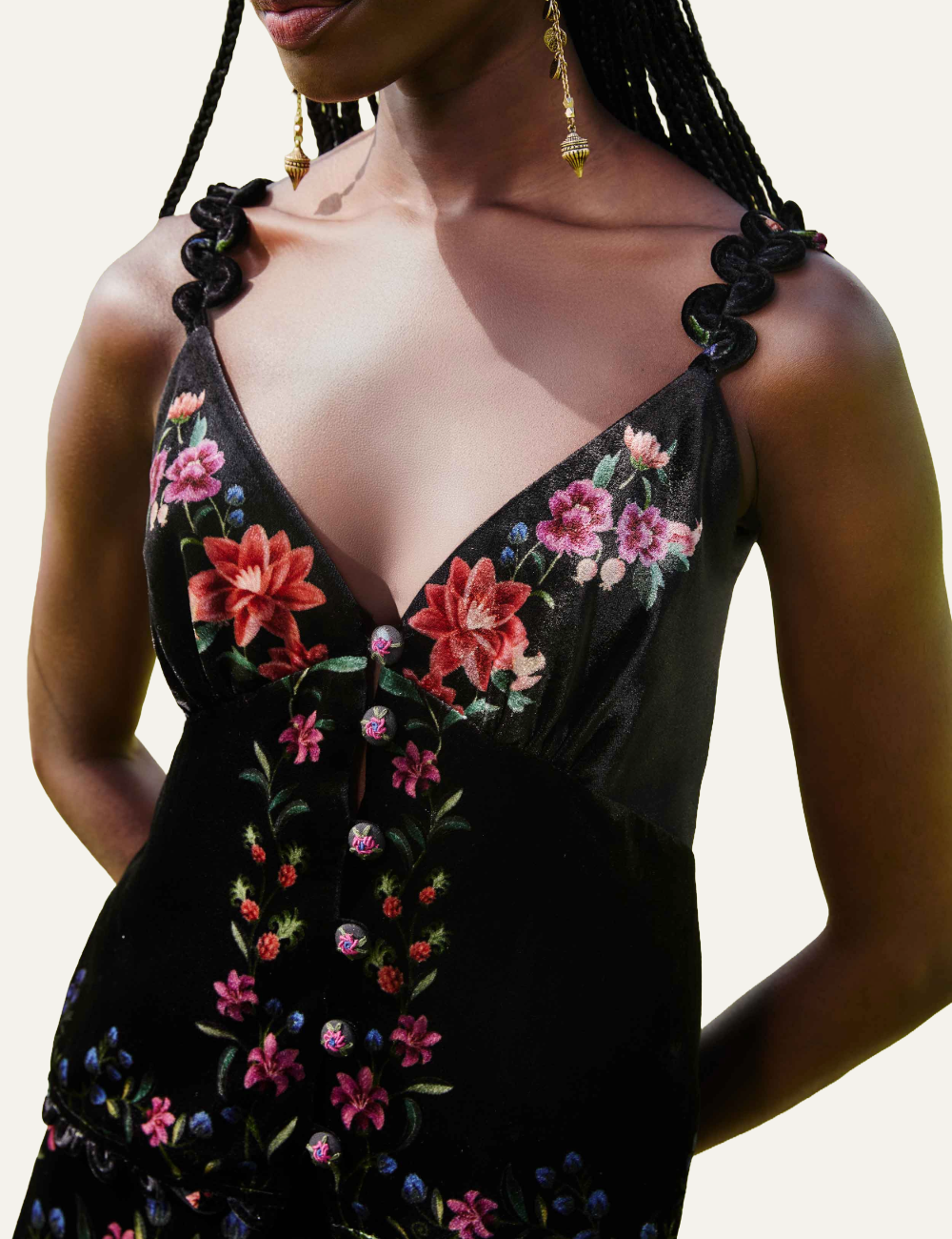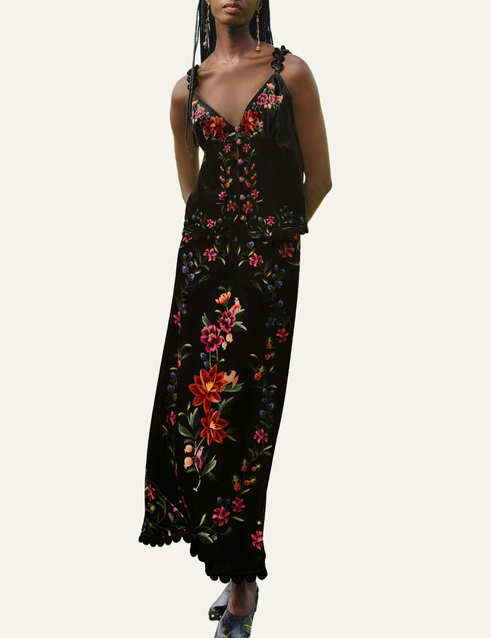 - Μαύρο φόντο με κεντημένα φλοράλ μοτίβα σε κόκκινους, ροζ και μπλε τόνους