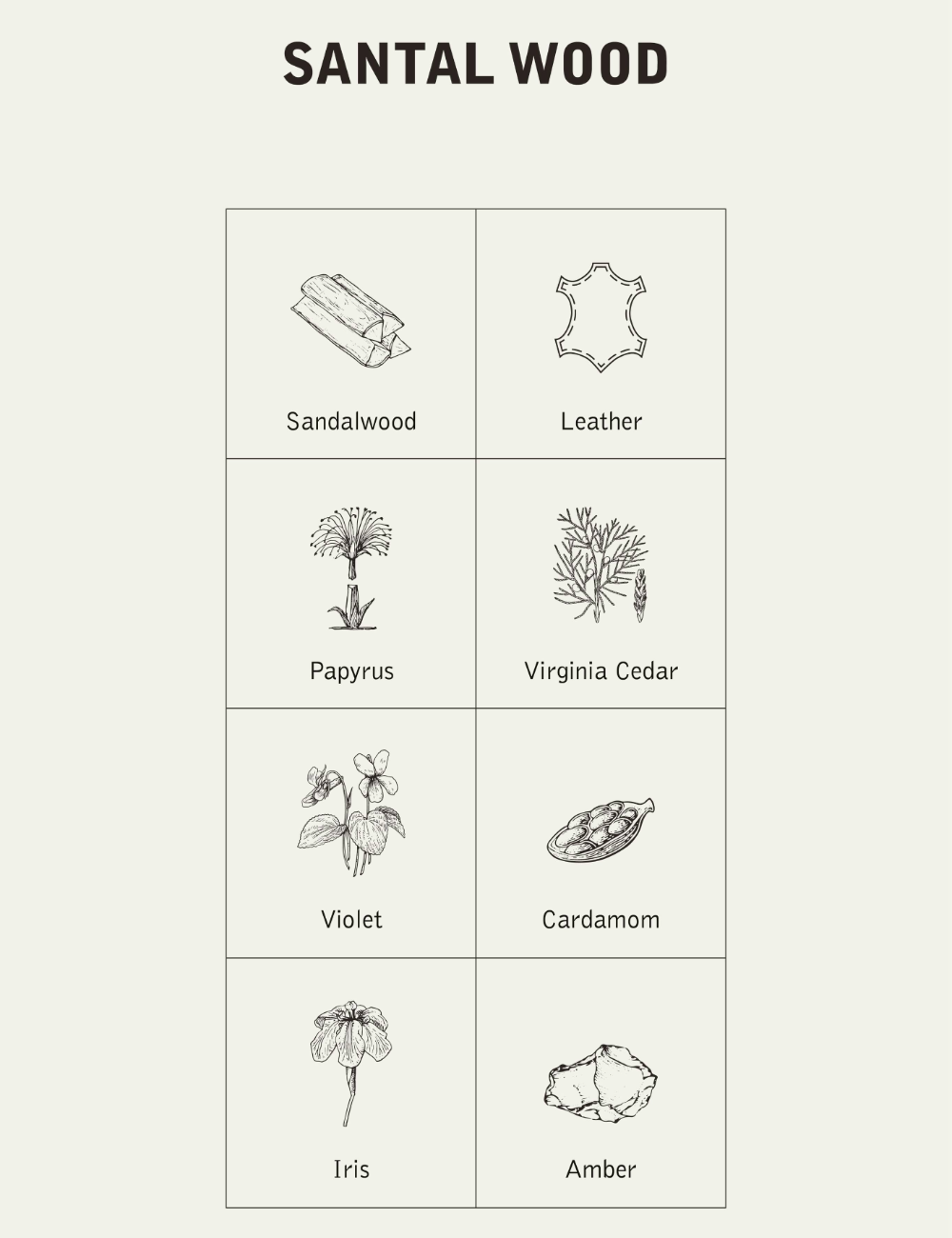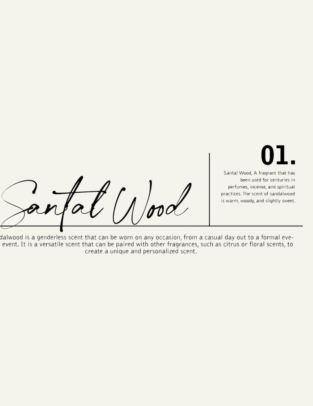 - Ζεστό, ξυλώδες και ελαφρώς γλυκό άρωμα σανταλόξυλου